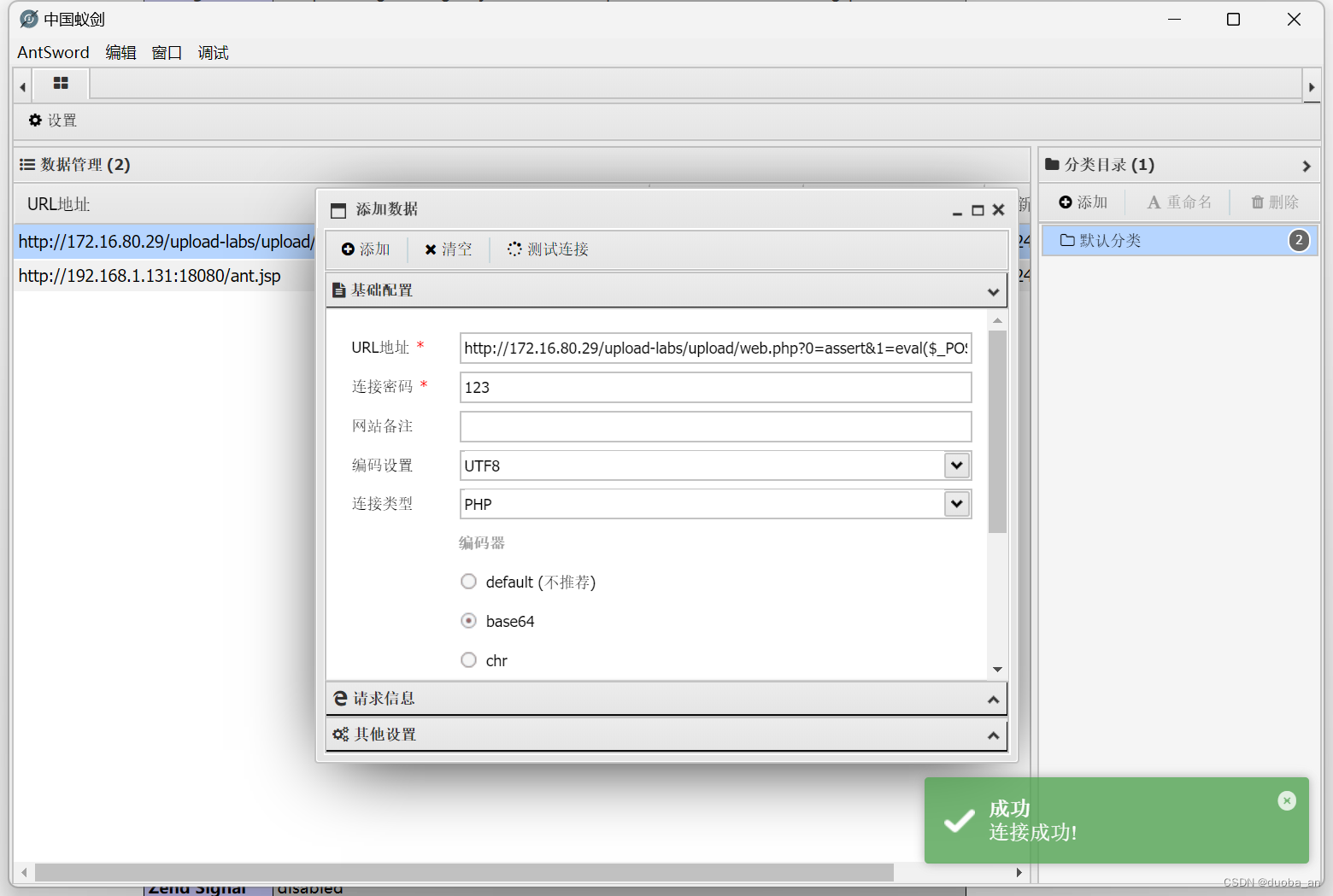 禁用之后母马直接上传成功,这里显示为一张图片,复制图片地址,然后在蚁剑上进行连接,