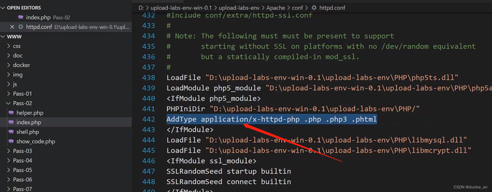 通过源码得知第三关使用的都被限制了,并且设定了更多的特殊解析后缀,所以使用特殊解析后缀已经无法绕过了,这里就可以使用到 .htaccess进行绕过测试。