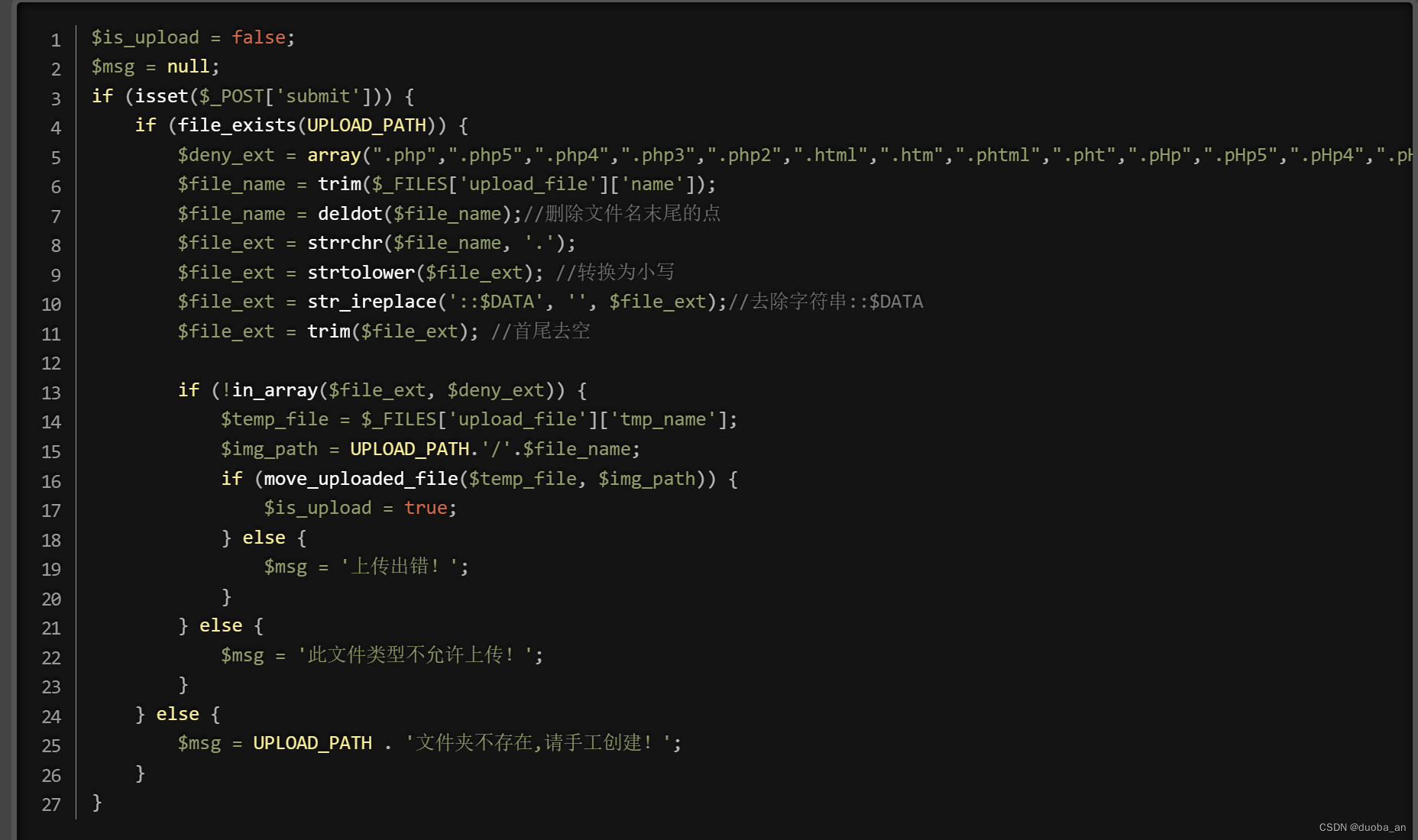 $deny_ext = array(".php",".php5",".php4",".php3",".php2",".html",".htm",".phtml",".pht",".pHp",".pHp5",".pHp4",".pHp3",".pHp2",".Html",".Htm",".pHtml",".jsp",".jspa",".jspx"