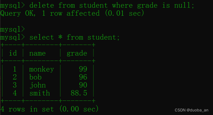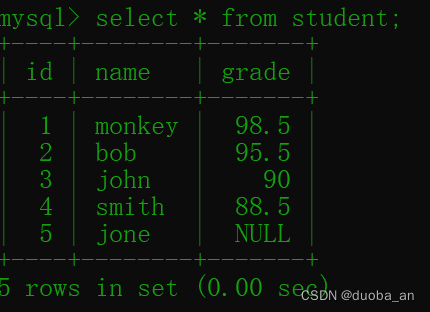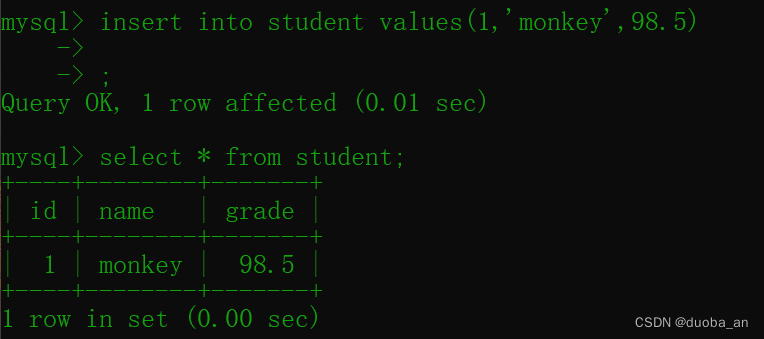 1、向student表中添加一条新记录 记录中id字段的值为1,name字段的值为"monkey",grade字段的值为98.5