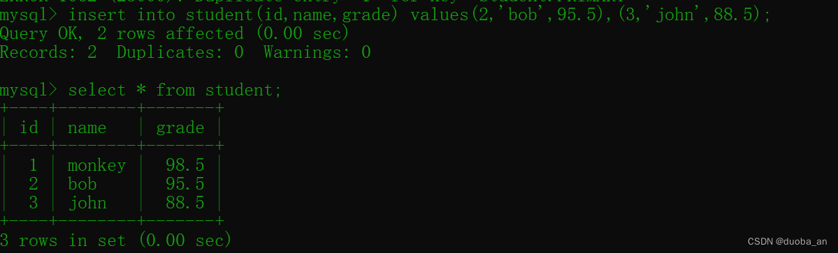 2、向student表中添加多条新记录 2,"bob",95.5 3,"john",90.0 4,"smith",88.5