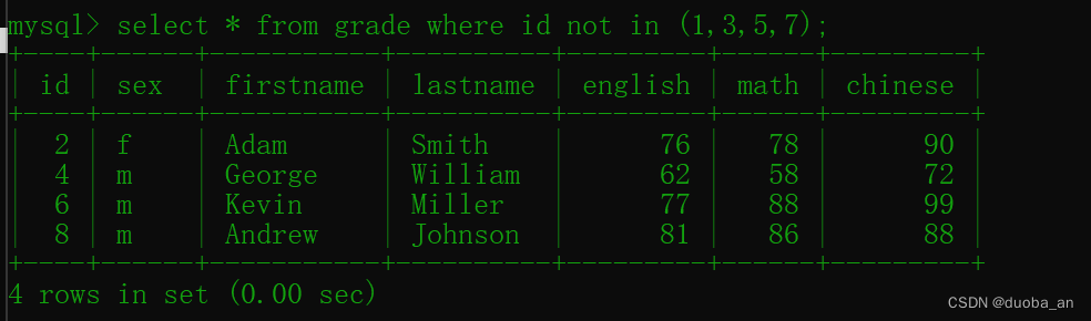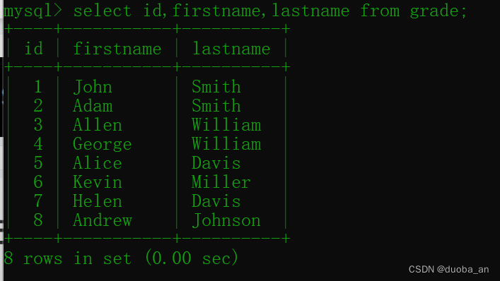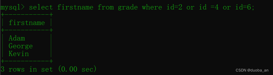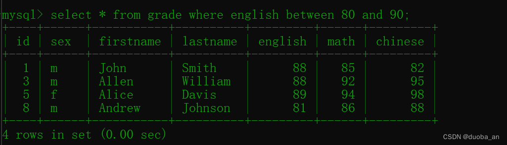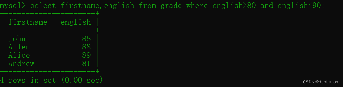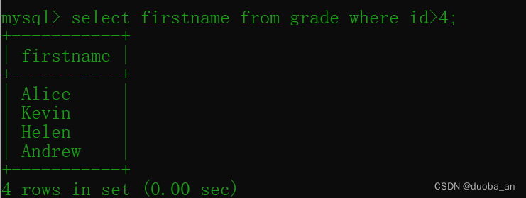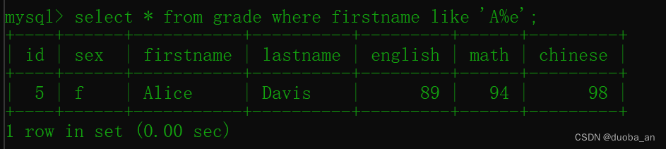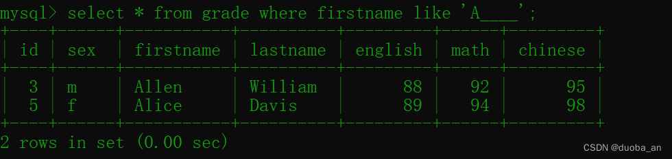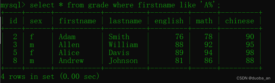 10、查询grade表中firstname以A开头后面有4个字符的记录