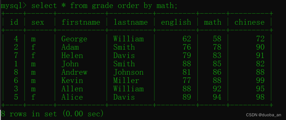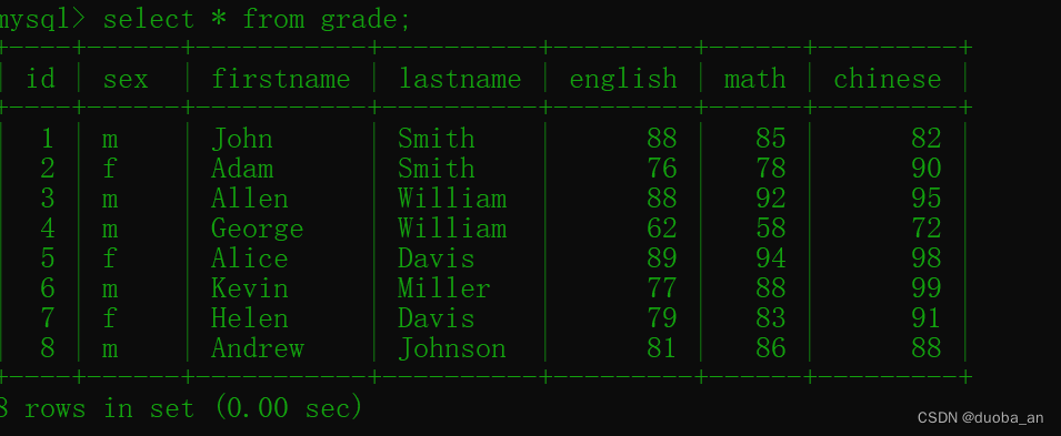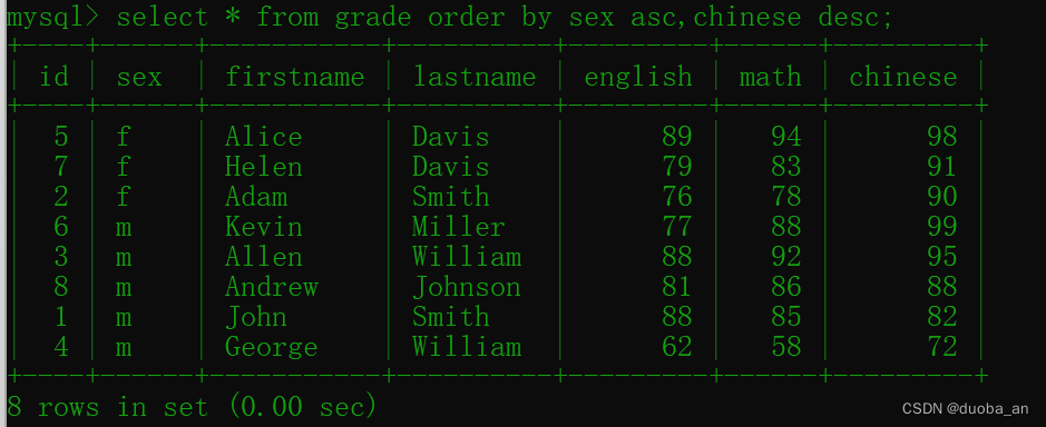 26、查询数据表grade中的记录,按照sex字段进行分组