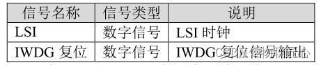 从 IWDG 框图整体认知就是,IWDG 有一个输入(时钟 LSI),经过一个 8 位的可编程预分频器提供时钟给一个 12 位递减计数器,满足条件就会输出一个复位信号。IWDG 内部输入/输出信号如下表: