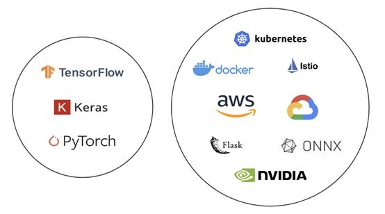 下图展示了机器学习和机器学习基础设施之间的区别,十分形象,易于理解: