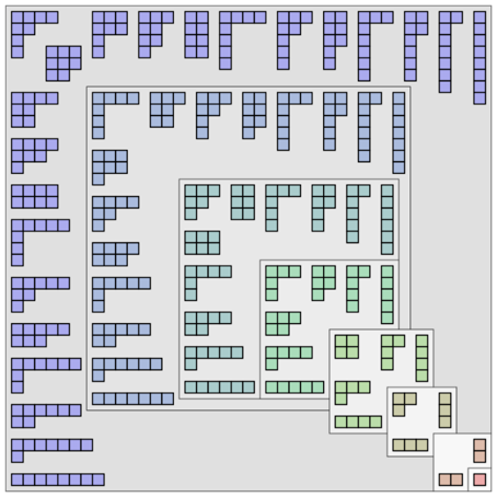 这些图被称为杨氏图表,展示了如何对各种数进行数学分割。对于数字1,有1种分法(1);对于2,有2种(2,1+1);对于3,有3种(1+1+1,1+2,3),但对于4,有5,5有7等等。10这个数字的分割方式正好有42种独特的方式。