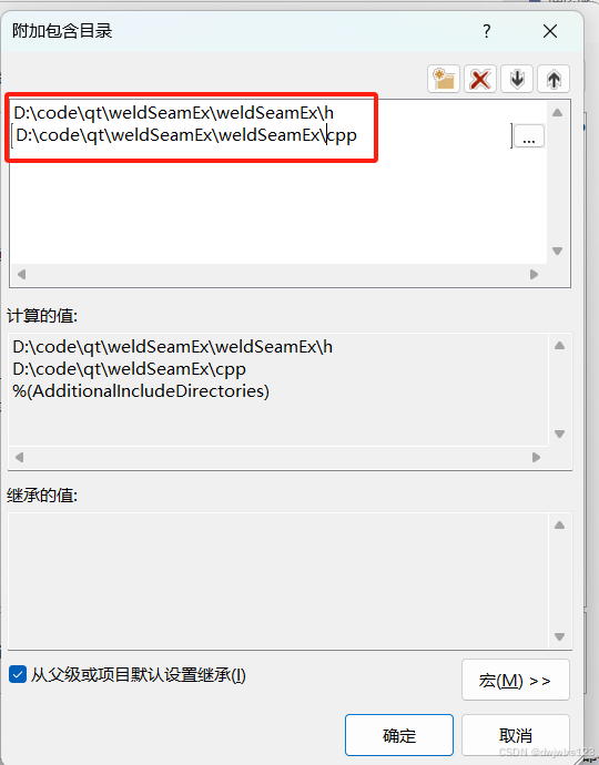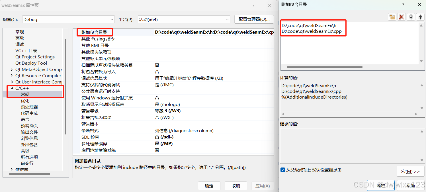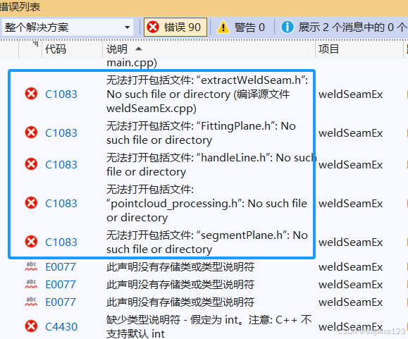 这是由于移动文件夹前添加的附加包含目录放置在D:\code\qt\weldSeamEx,移动之后放置在D:\code\qt\weldSeamEx\weldSeamEx。所以多加一层嵌套即可。
