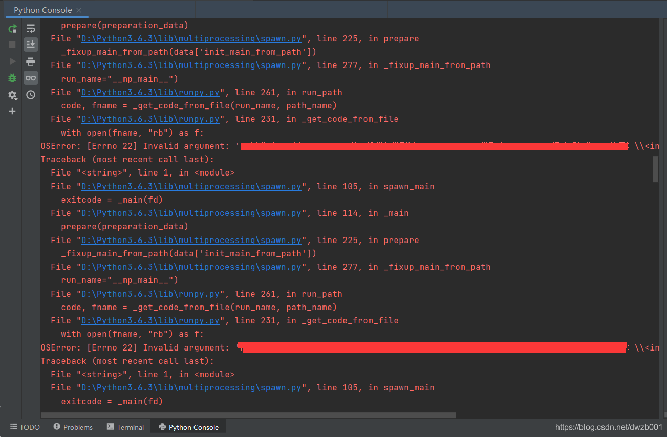 从上面这2张图可以看到,即使是最简单的生成进程池操作,直接在Python Console里运行都会重复不断地报以下错误。强制结束整个程序后还会报“PermissionError: [