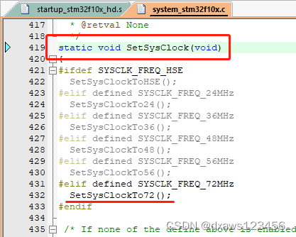 7:从上图 SetSysClock函数划红线处看到系统时钟设置了72M,点击宏定义标识符查看,根据需要可以选择不同的时钟频率,如下图: