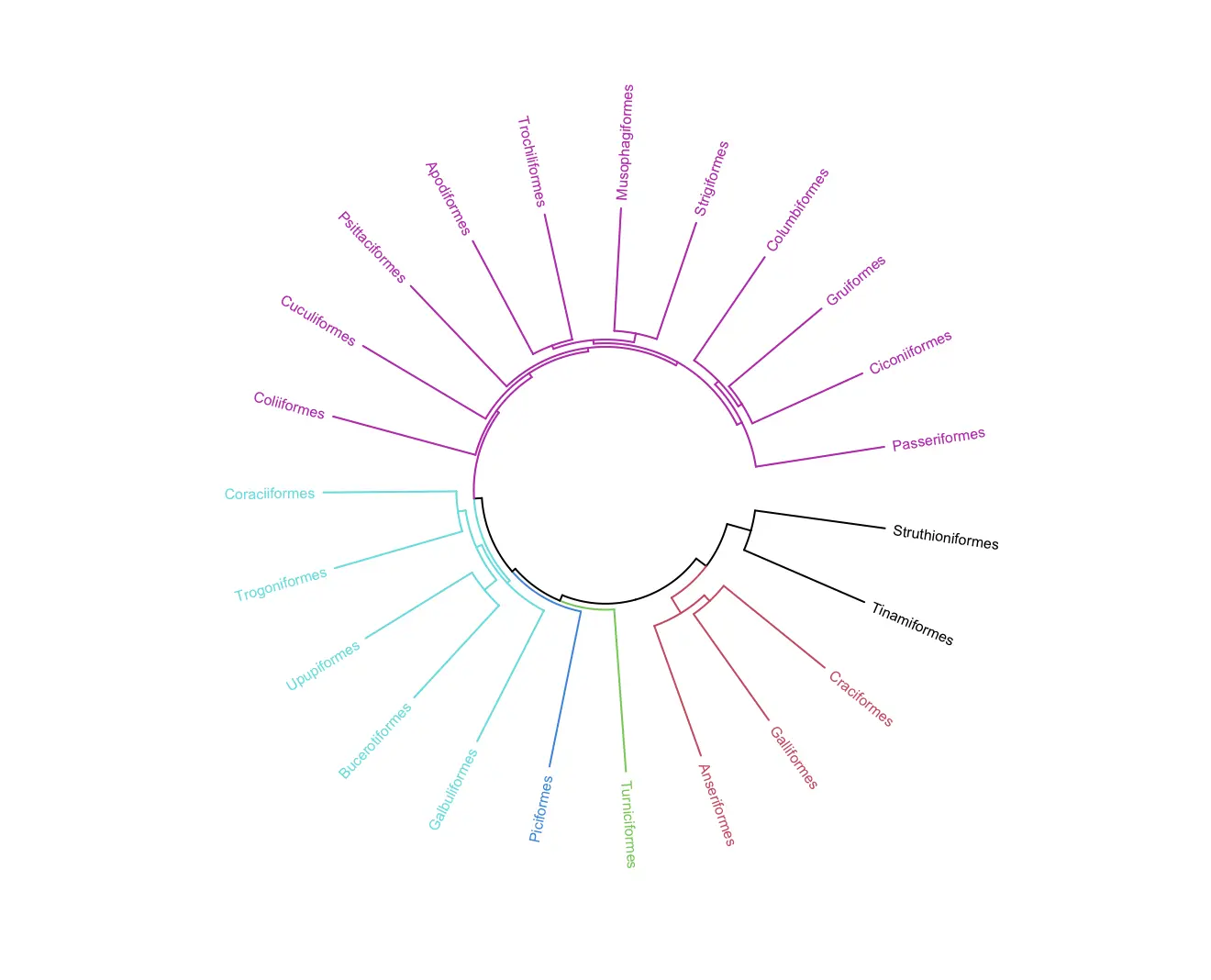 首先,导入 ape 包提供的鸟类物种信息,并对数据进行层次聚类