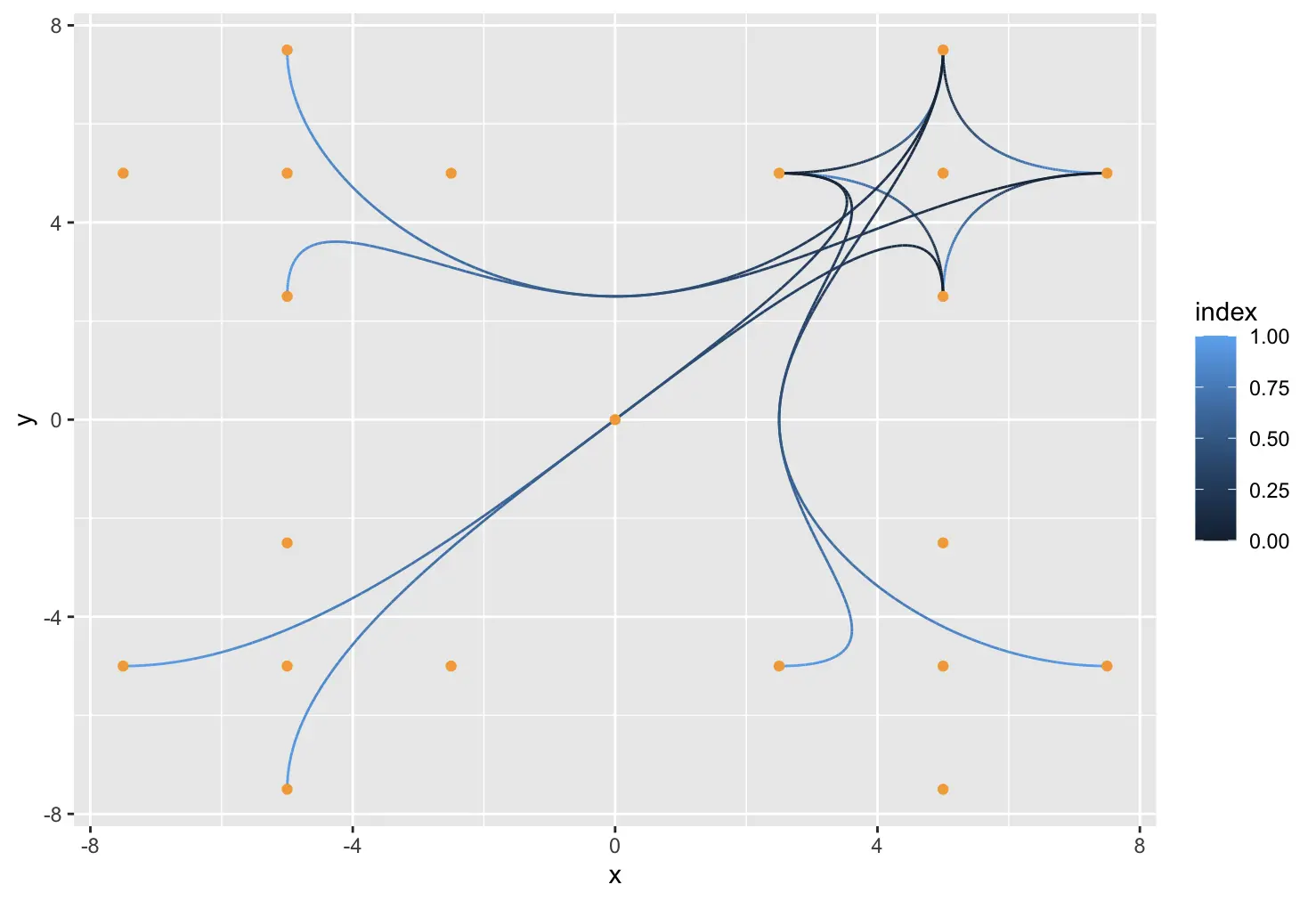 geom_link 与 geom_segment 类似,但是通过在两个点之间内插许多个点来实现的。其计算属性 index 表示点序列,可以用来将线条绘制成渐变色。