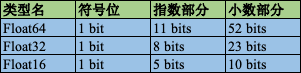 上表中列出的浮点类型 Float64、Float32 和 Float16 中每种类型都包括一个符号位、一组表示指数的位和另一组表示分数或小数的位。