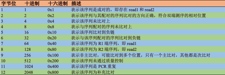 例如,一条 read 的 FLAG 值为 96 = 32 + 64,即该 read 为 read1,且 read2 比对到负链。