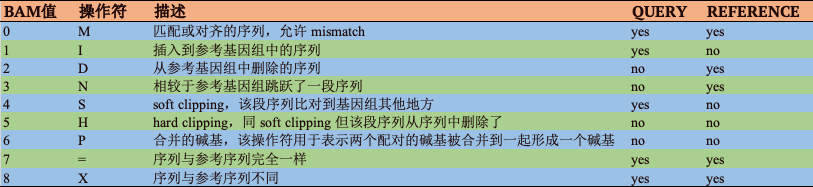 H和S只能出现在两端;N只在RNA比对到DNA上用到,表示内含子,其他情况并不会使用;M/I/S/=/X的长度和就是该条序列的长度(query列),M/D/N/=/X的长度表示比对到的参考基因组的长度(reference列)。