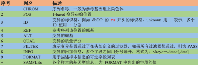 VCF 的正文位于标题之后,用制表符分隔成 8 个必填列和数量不限的可选列,可用于记录有关样本的变异信息。