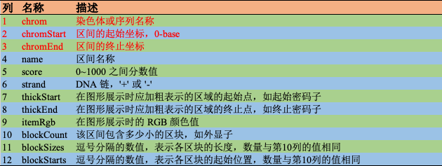 BED(Browser Extensible Data)格式是一个较为简单的文件格式,用于描述基因组区域的位置信息。一般来说,标准的 BED 格式至少需要 3 个字段,可添加九个可选字段,共十二列,每一行表示基因组上的一段区间。