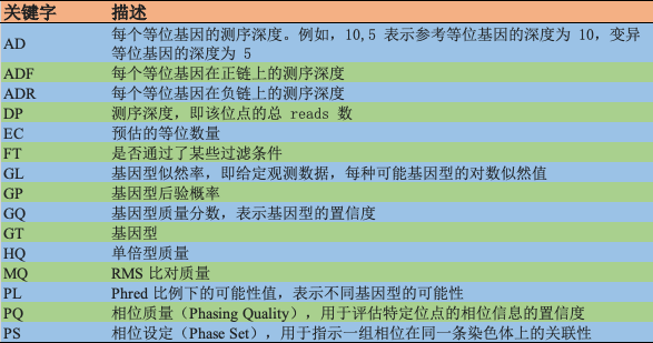 类似于 INFO 字段,FORMAT 字段定义了每个样本应该包含哪些信息,也可以从头部对应字段的关键字的定义信息来查看具体含义。