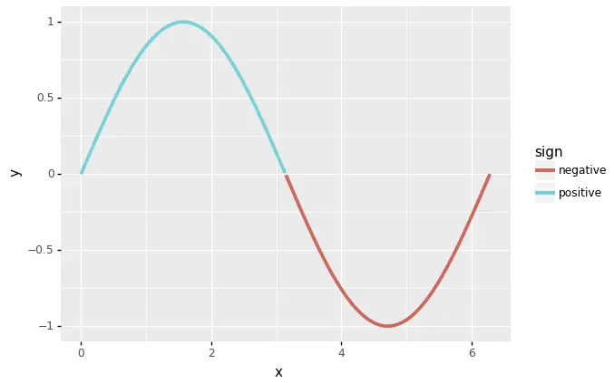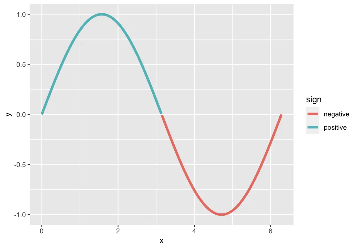 mutate(y = sin(x), sign = if_else(y >= 0, "positive", "negative")) %>%