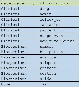 # [5] "biospecimen_sample_brca" "biospecimen_diagnostic_slides_brca"