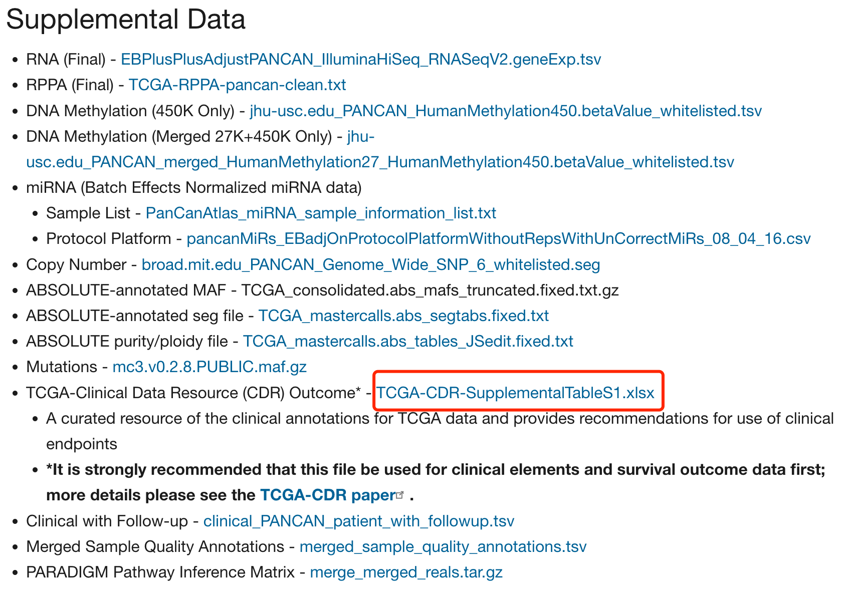 或者从 TCGA 泛癌分析 提供的页面中,下载临床数据或其他数据