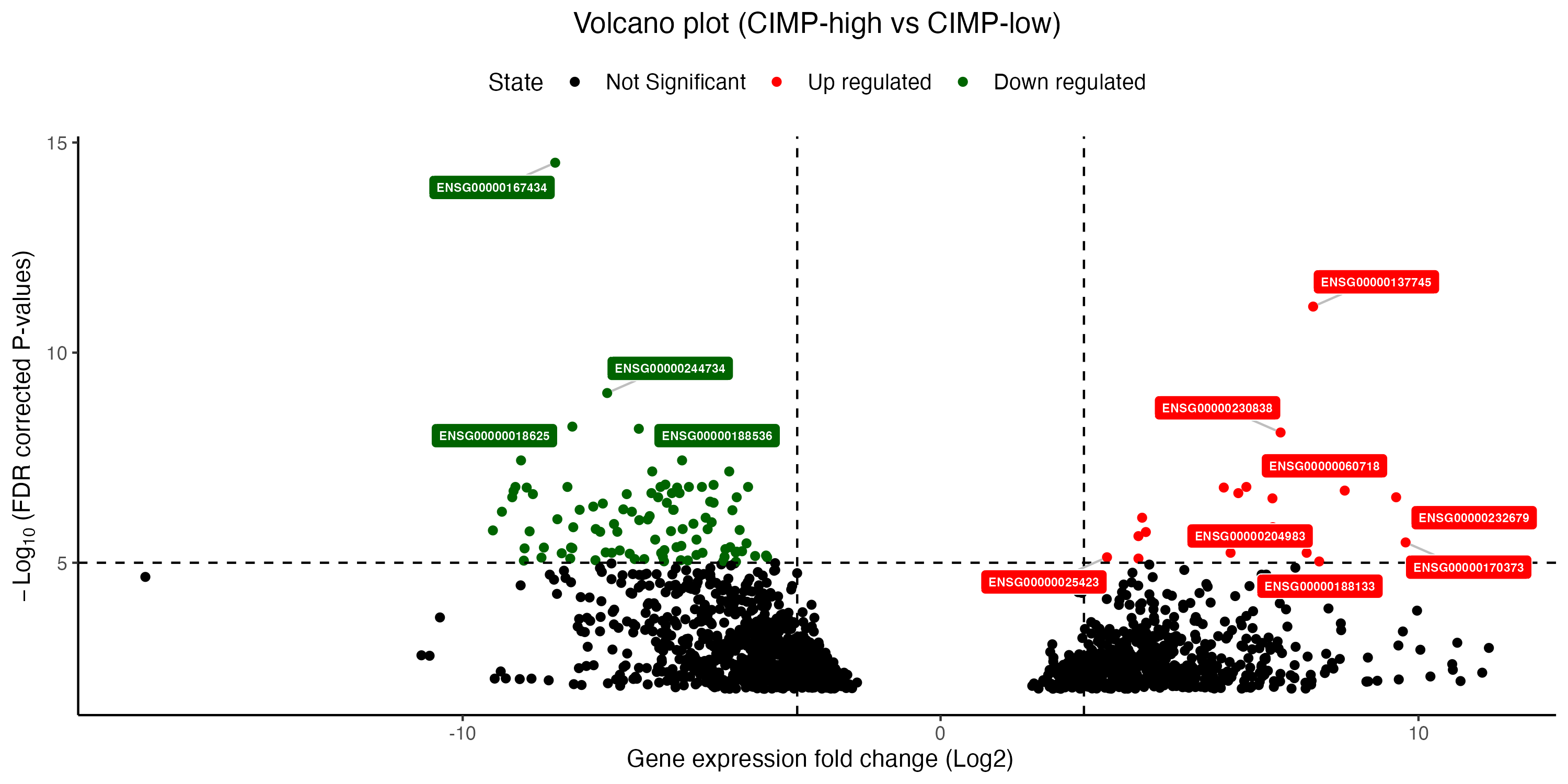 该函数将绘制一张图片并返回一个矩阵,其中包含基因表达(上调/下调)和甲基化(高/低甲基化)相关的状态。