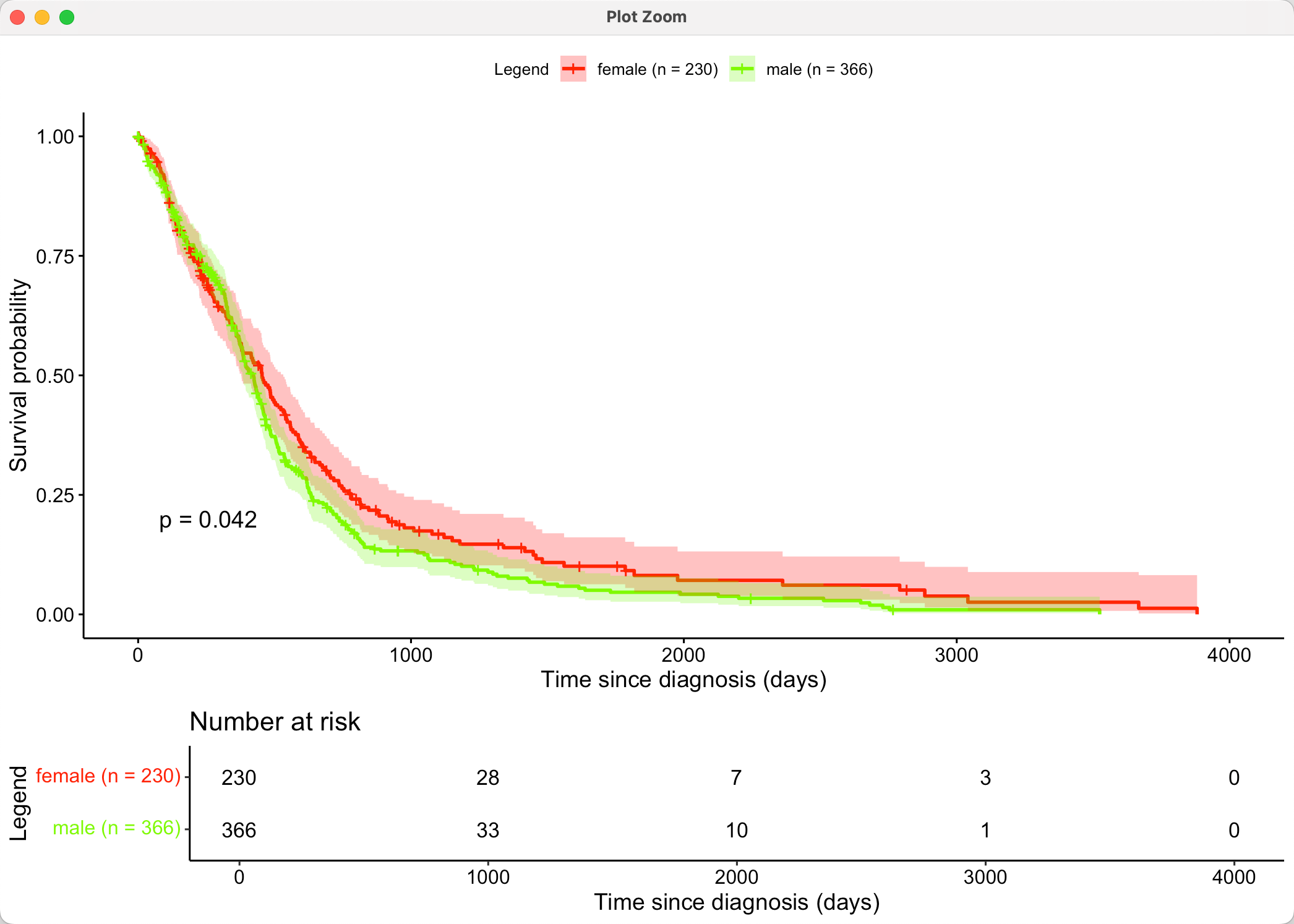 tabSurvKM <- TCGAanalyze_SurvivalKM(