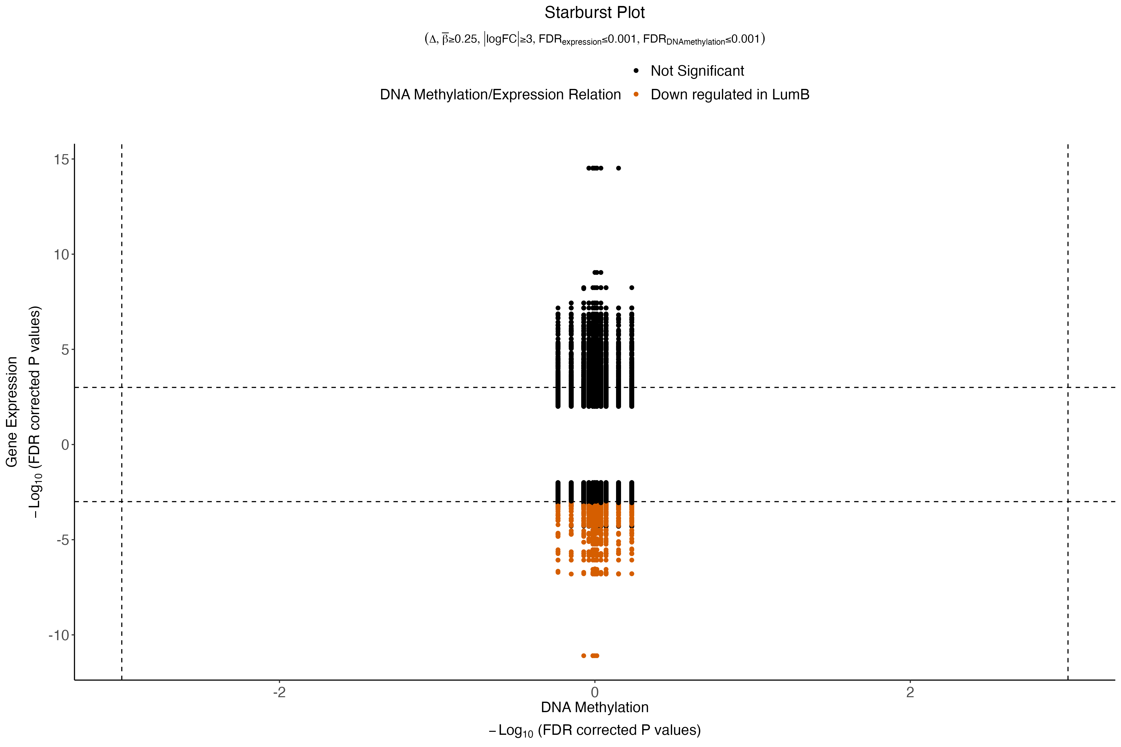 starburst plot 通过结合两个火山图的信息,并应用于 DNA 甲基化和基因表达的研究。它于 2010 年首次提出(Noushmehr 等人)。我们可以使用 TCGAvisualize_starburst 函数。