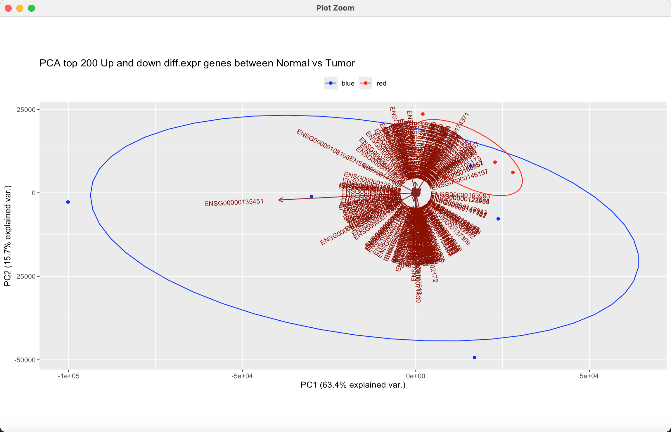 我们可以使用 PCA 来进行降维分析。函数 TCGAvisualize_PCA 将绘制不同组的 PCA 图。