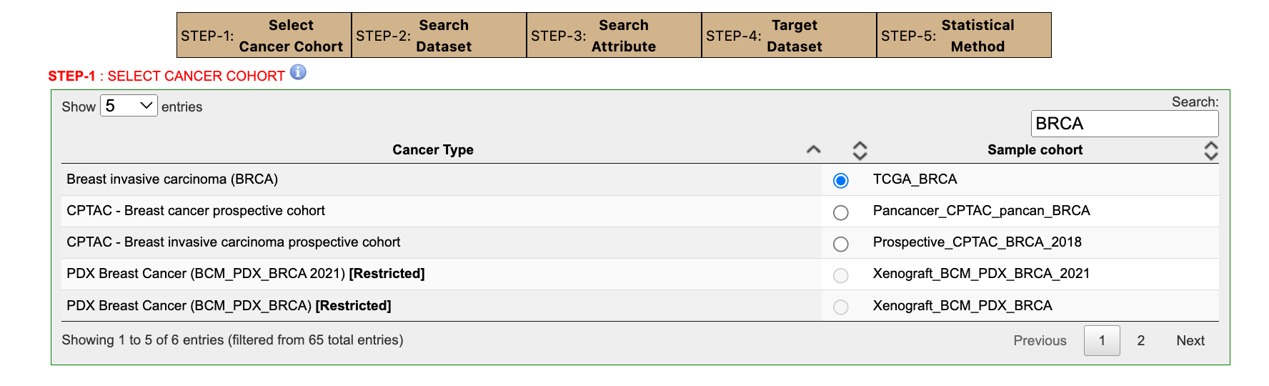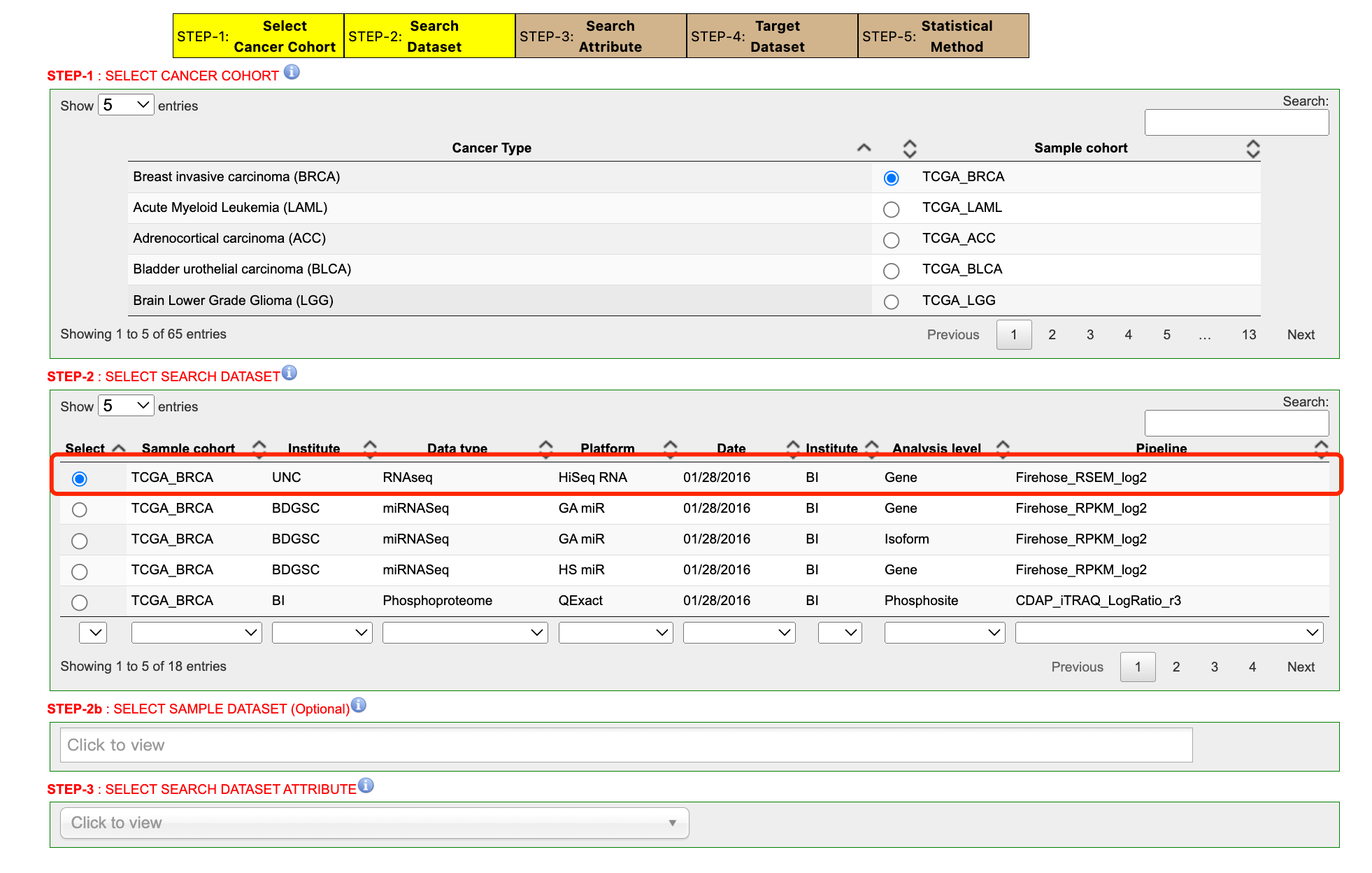 例如,我们选择 BRCA,点击选中后会自动跳出下一步