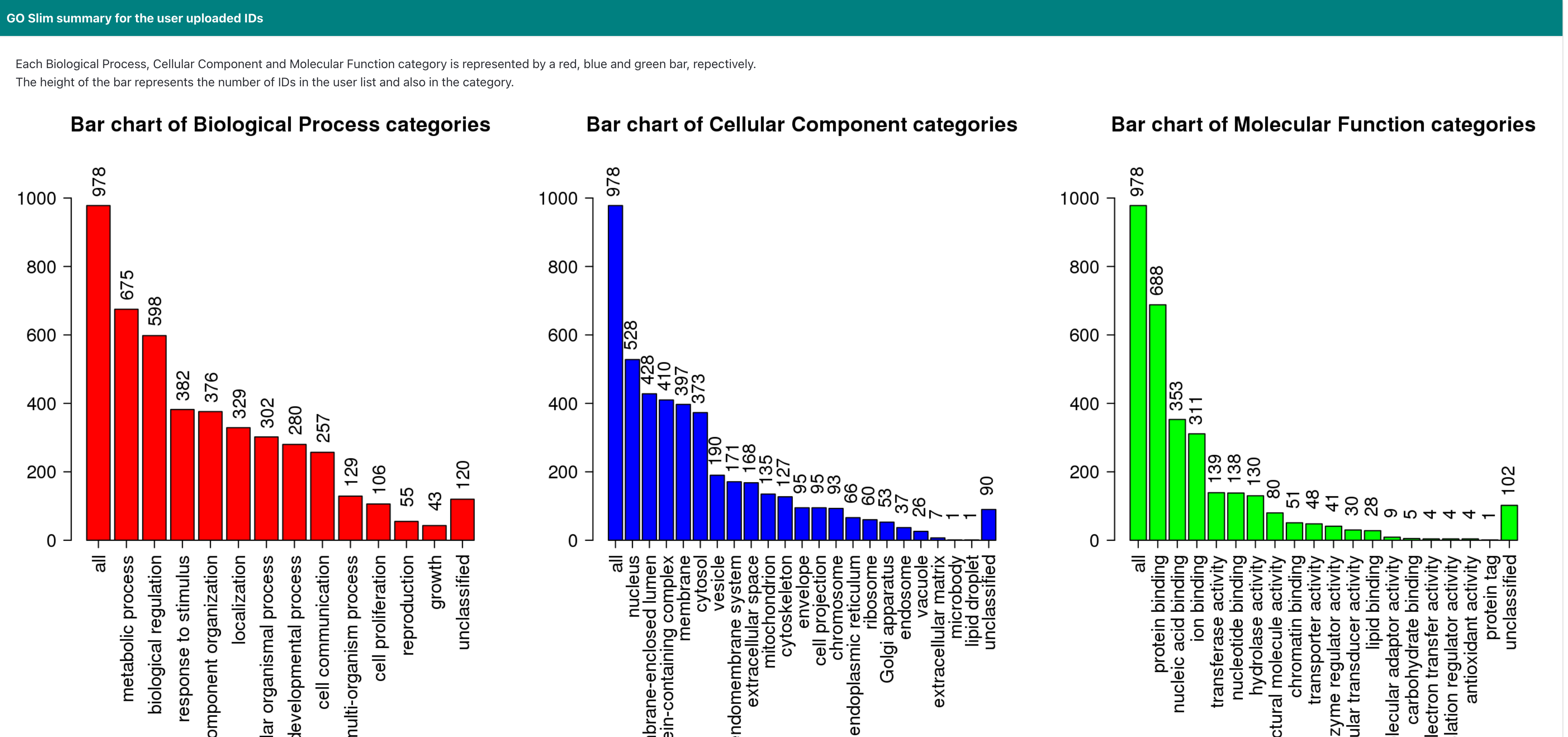 点击 GO Slim summary for the user uploaded IDs 可以看到 GO 通路富集结果的柱状图