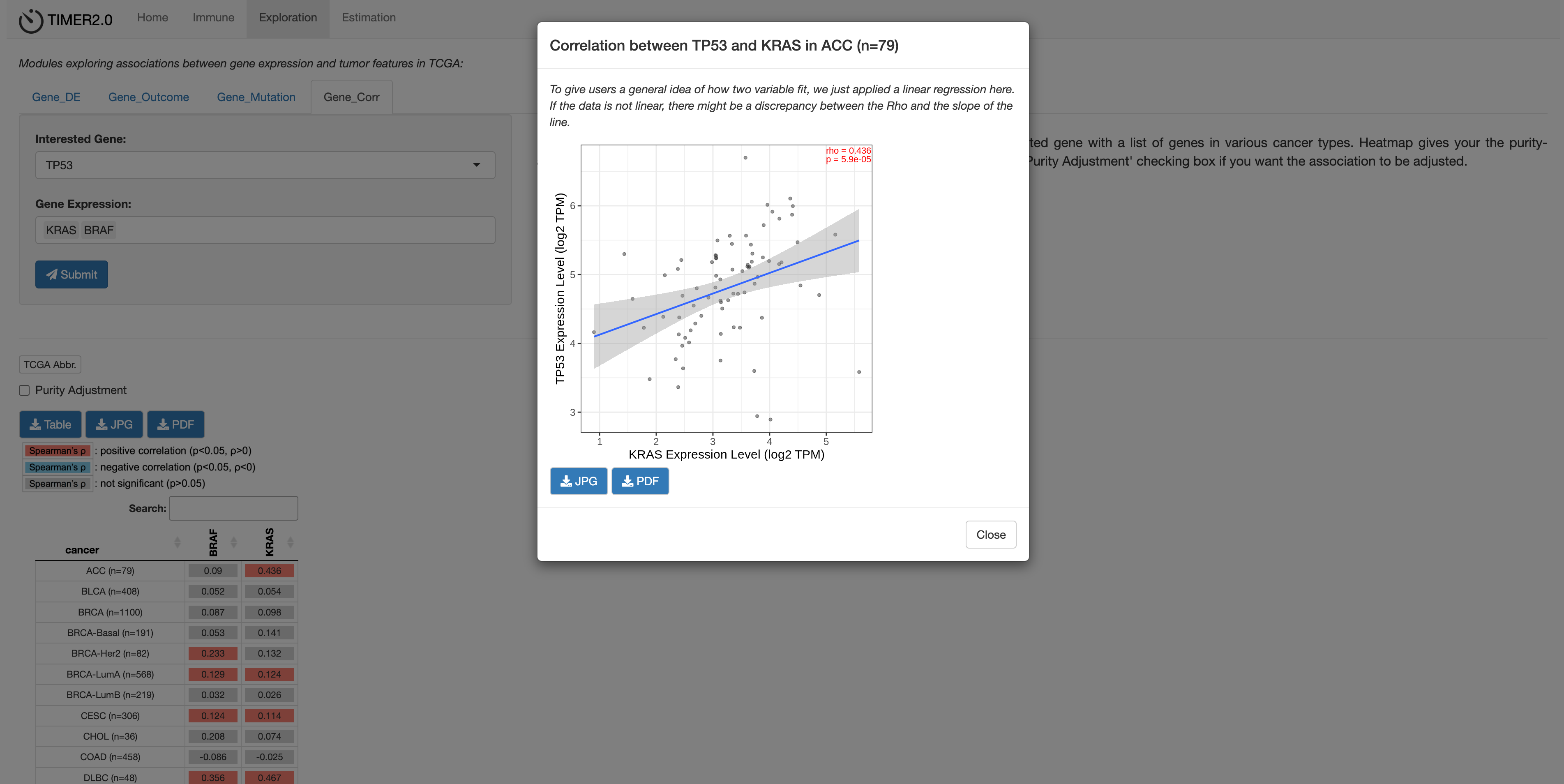 点击其中某个值,会弹出一个窗口,显示基因表达与肿瘤纯度及免疫细胞浸润水平的相关性散点图。