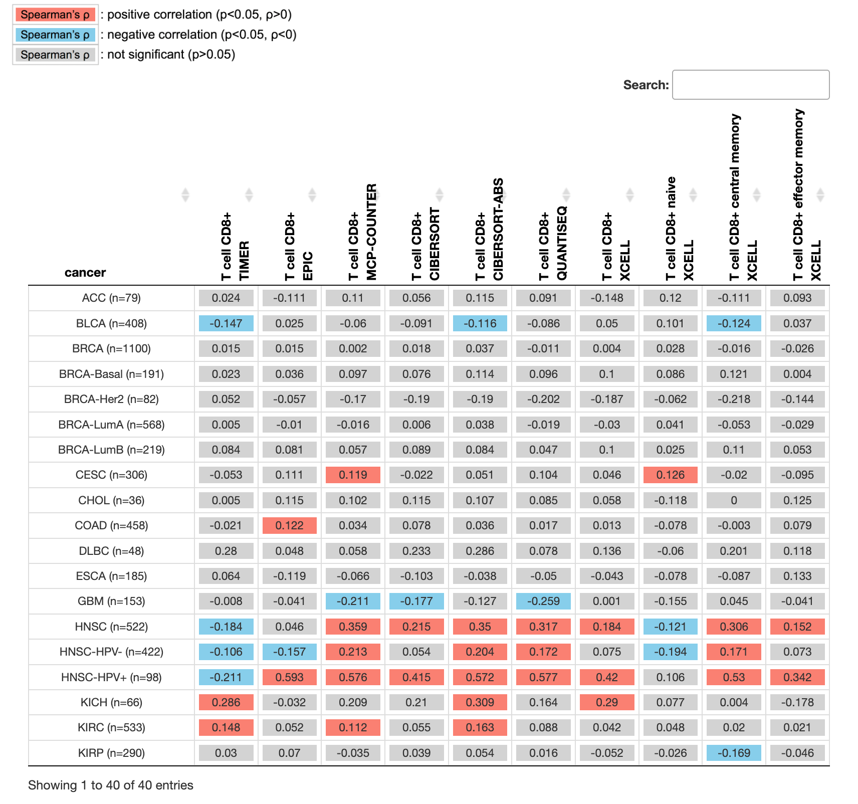分析完后,会返回一个表格。表示不同癌症类型中,目标基因与对应免疫细胞浸润水平的相关性,会展示不同算法的计算结果。