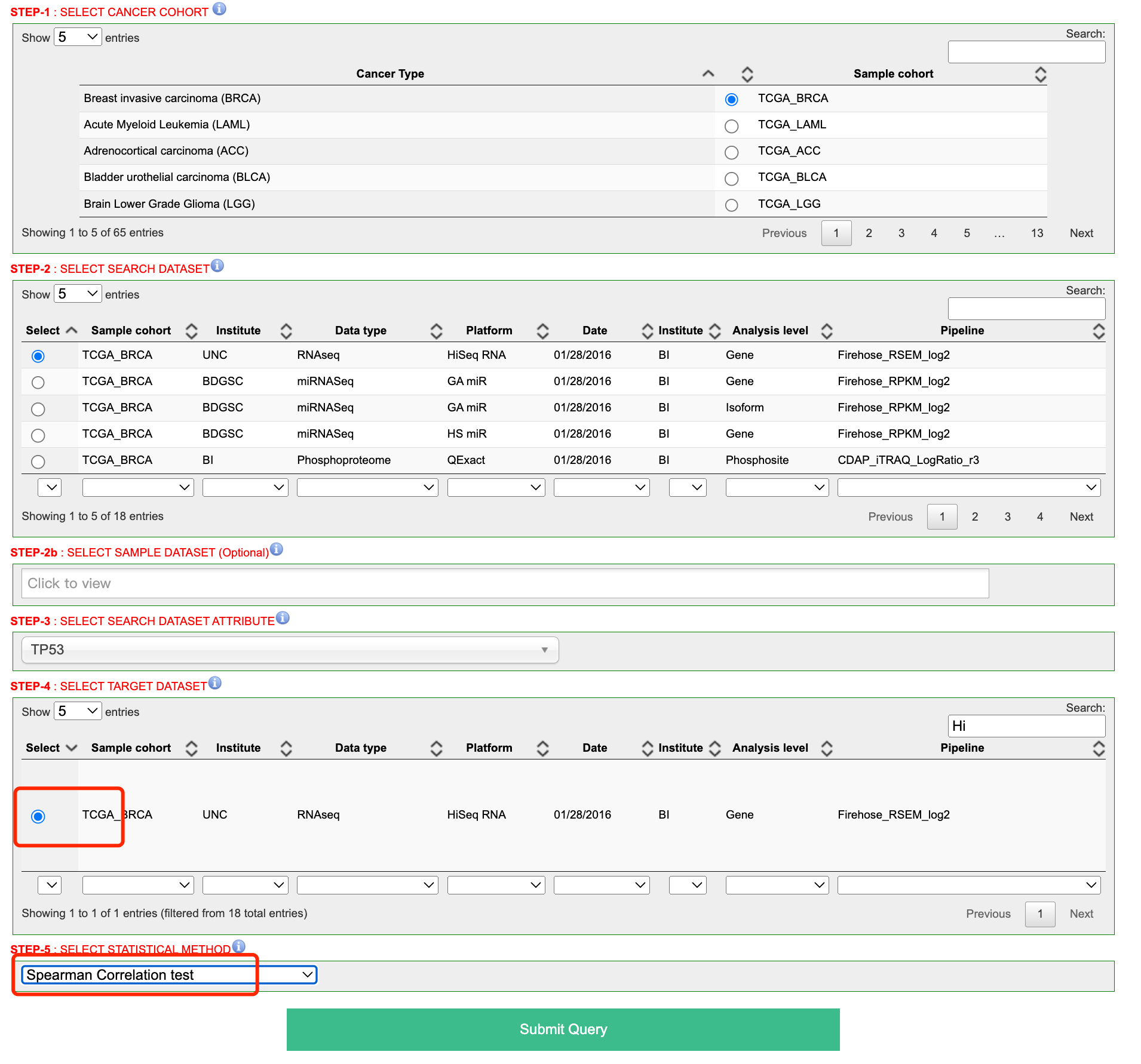 分析主要包括 5 个步骤:选择癌型,选择数据集,选择基因或其他特征,选择目标数据集,最后选择统计方法。
