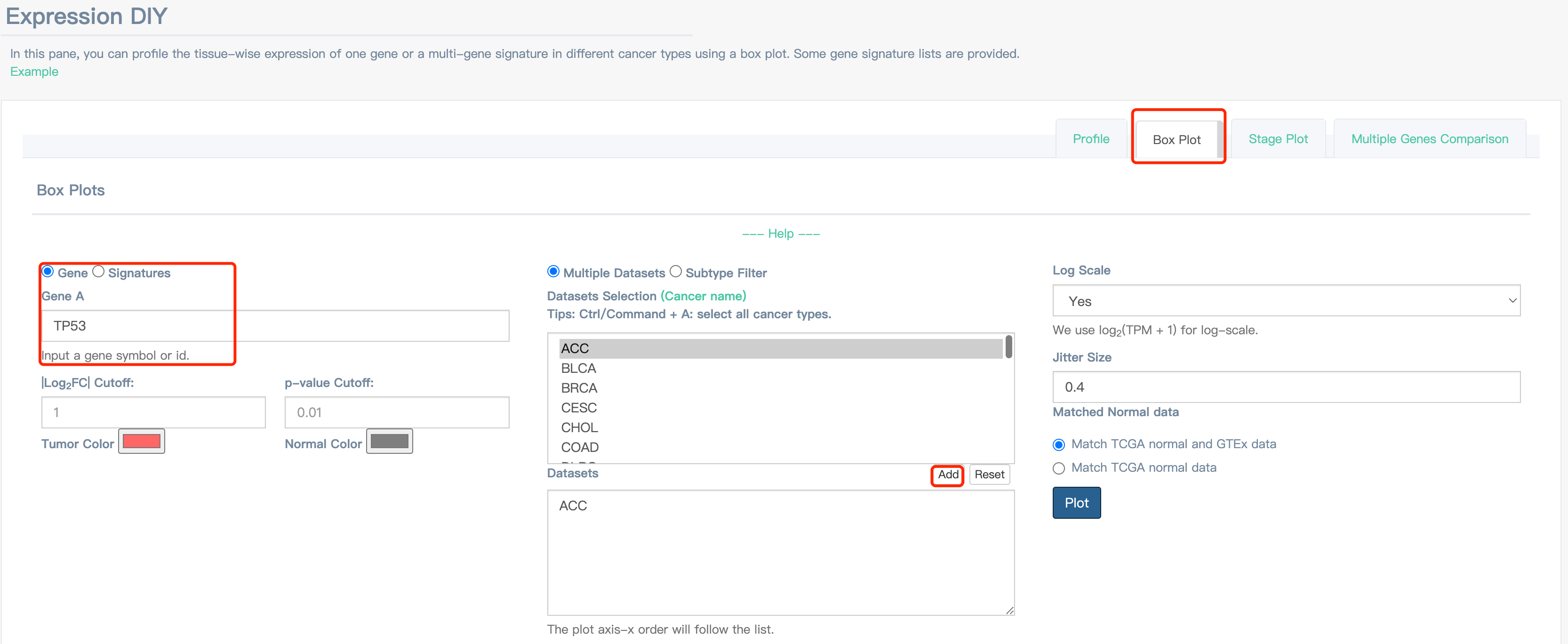 左侧选择 Expression Analysis,选择 Expression DIY,然后选择基因以及对应的癌症类型