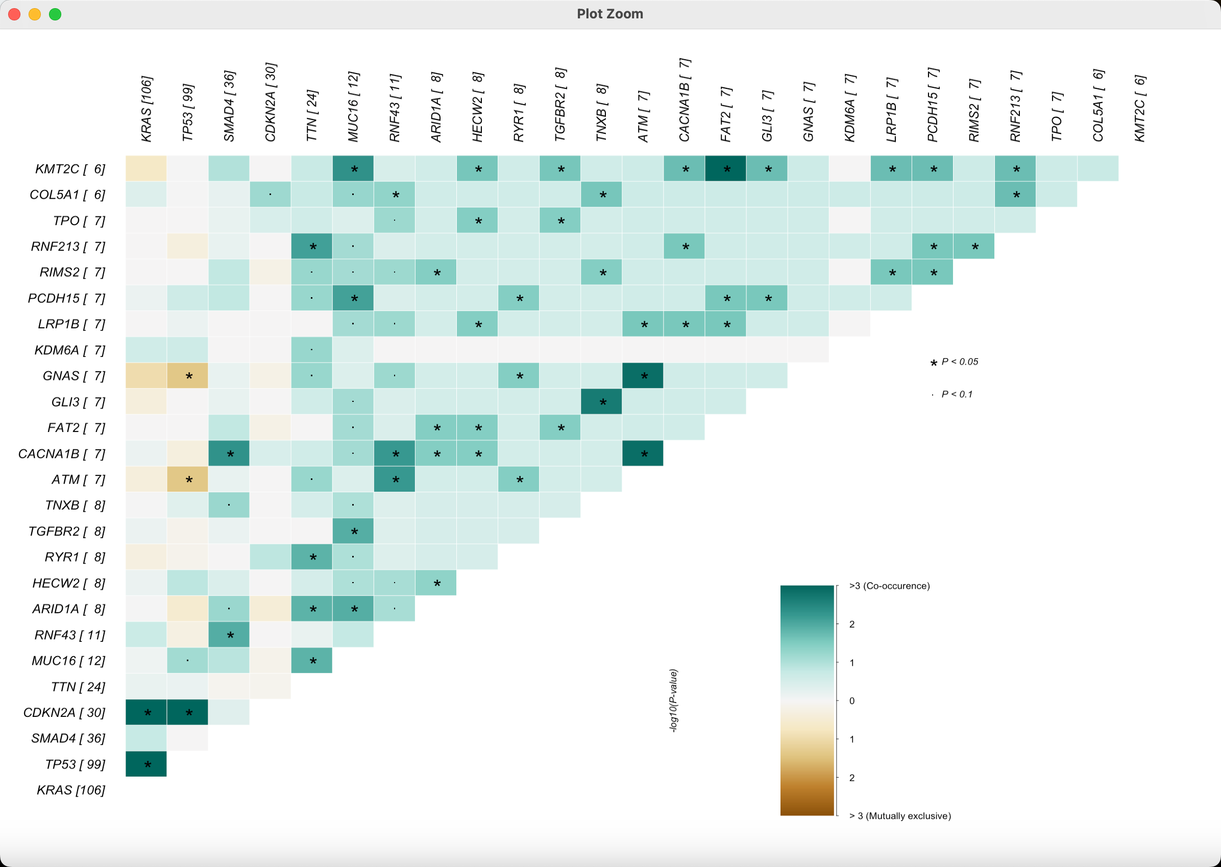 可以看到突变率前 10 的基因中,同时出现突变的基因对偏多