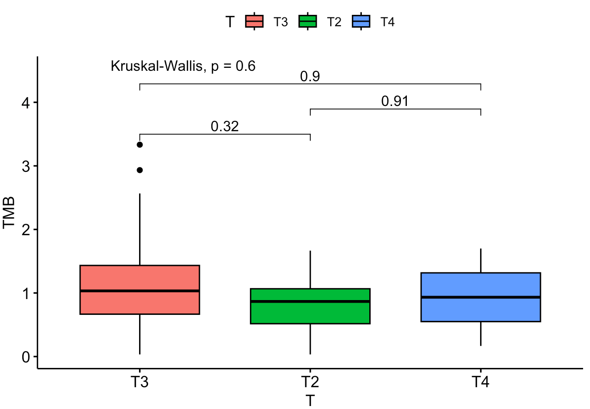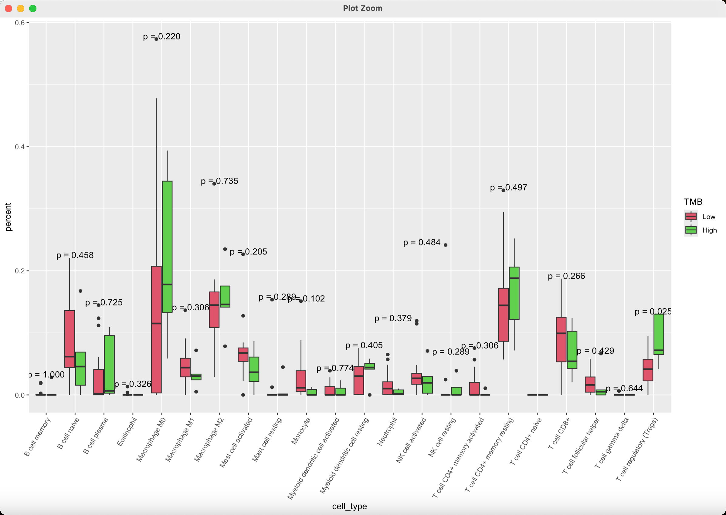 我们可以比较 TMB 高低两组样本之间,免疫细胞占比是否存在差异。我们使用 wilcox 秩和检验