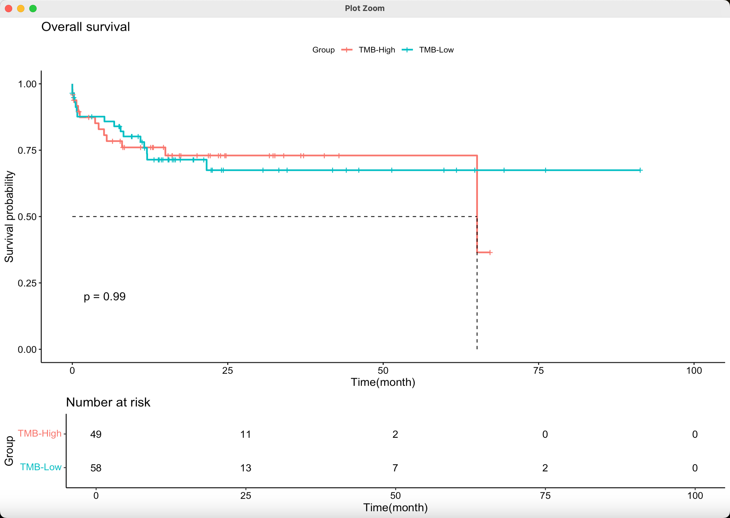 虽然从图像上看,生存曲线是分开的,但是 P 值并不显著,可能由于样本量太少了,没有显著性,也是类似的。
