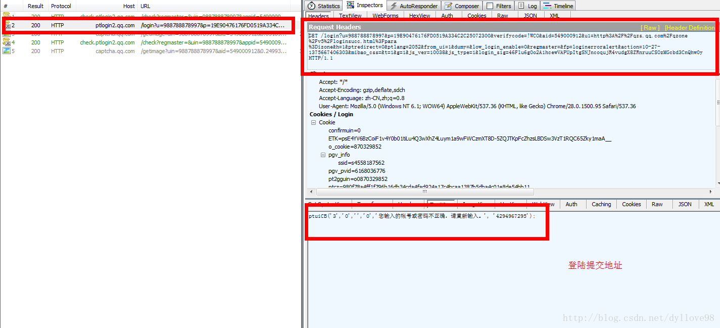 1、抓包获取QQ空间或者邮箱登陆地址,分析参数,用户名,密码,验证码,gtk,随即数。