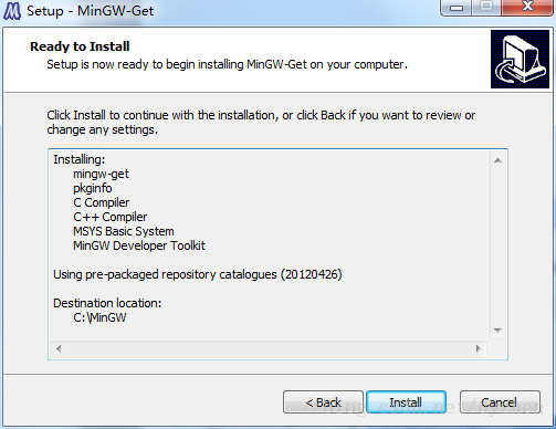 2. 运行mingw-get-inst-20120426.exe,按下图所示步骤选项安装,尤其注意必须安装在C:\MinGW下(官方建议)。