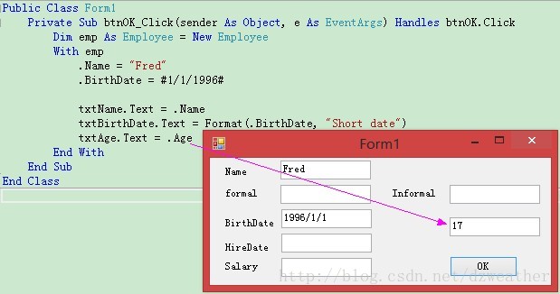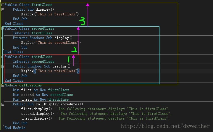 MsgBox("Accessed through derived class: " & derObj.z) '子类变量,故 *