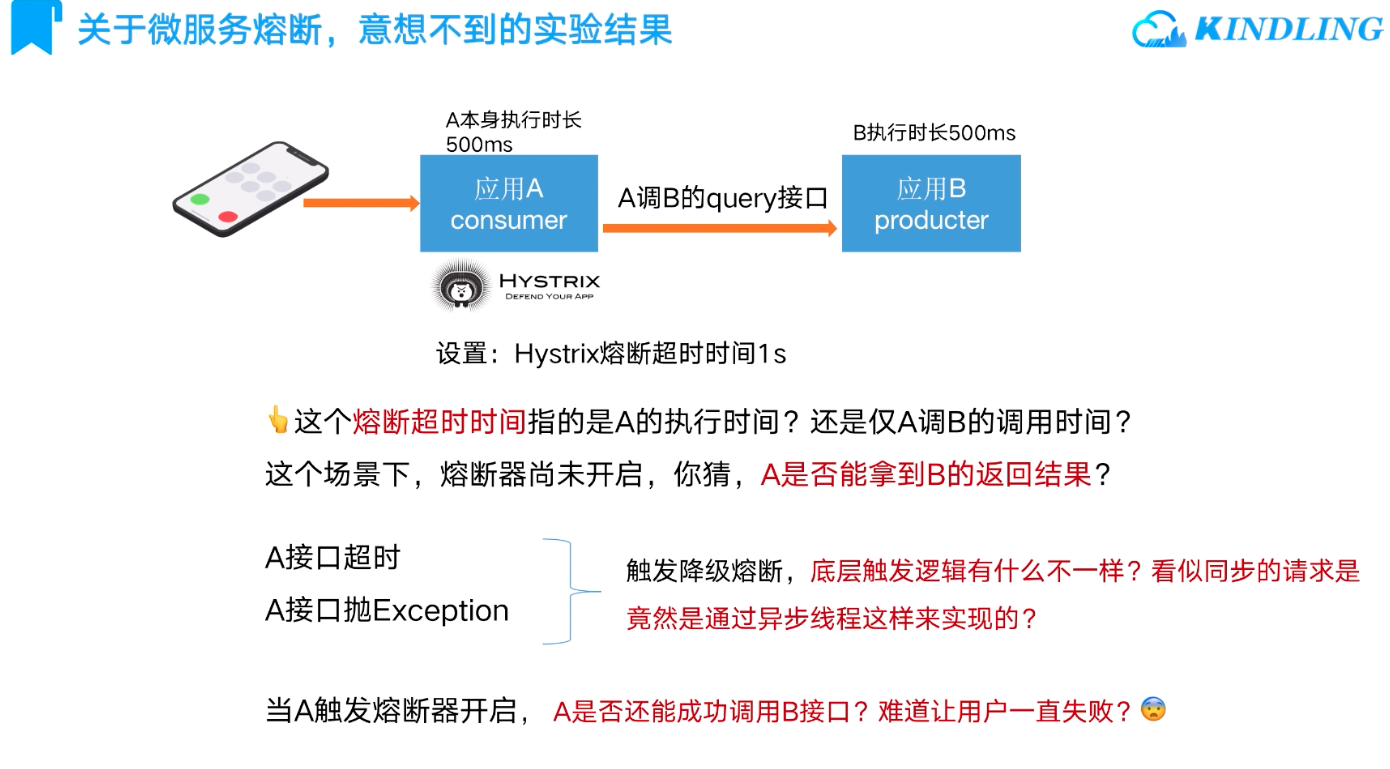 眼见为实:关于微服务熔断这几个知识点,你可能理解错了 可视化微服务熔断实验,当在应用A某接口上加了熔断器:1. 熔断超时时间指的是接口的执行时间,还是仅接口调用下游服务的时间?2. A接口超时、和抛Exception这两种场景都会触发降级熔断,底层逻辑有什么不同?看似同步的请求竟然是通过异步线程实现的?3. 当A的熔断器触发开启,它是否还能成功调用下游服务?总不能让用户一直失败吧?
