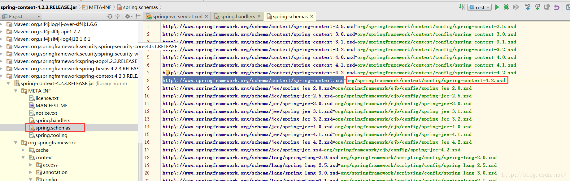 spring是默认从本地加载xsd文件的,举个栗子:我们打开spring-context的jar包,找到spring.schemas这个文件