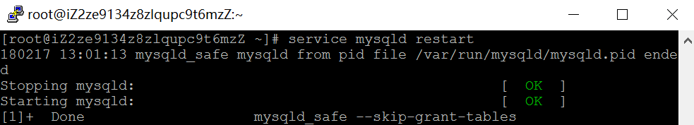 [root@iZ2ze9134z8zlqupc9t6mzZ ~]# mysqld_safe --skip-grant-tables &