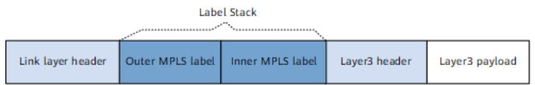 标签栈(Label Stack)是指标签的排序集合。,靠近二层首部的标签称为栈顶MPLS标签或外层MPLS标签(Outer MPLS label);靠近IP首部的标签称为栈底MPLS标签或内层MPLS标签(Inner MPLS label)。理论上,MPLS标签可以无限嵌套。目前MPLS标签嵌套主要应用在MPLS VPN、TE FRR(Traffic Engineering Fast ReRoute)中。标签栈按后进先出方式组织标签,从栈顶开始处理标签。