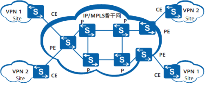 P(Provider):服务提供商网络中的骨干设备,不与CE直接相连。P设备只需要具备基本MPLS转发能力,不维护VPN信息。