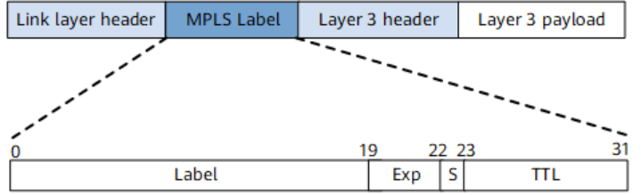 MPLS报文与普通的IP报文相比增加了MPLS标签信息,MPLS标签的长度为4个字节。MPLS标签封装在链路层和网络层之间,可以支持任意的链路层协议。