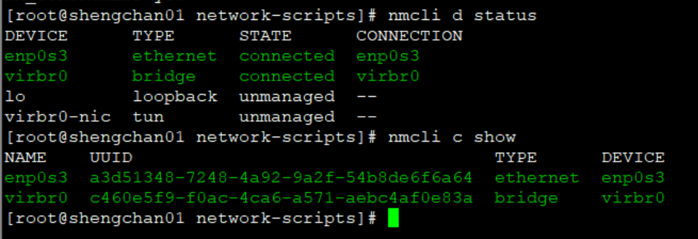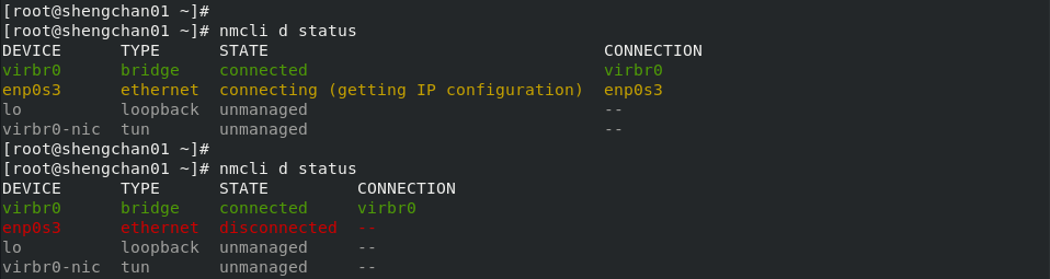 此次测试使用了vi文件的方式,设置完成后,使用Xshell工具可以连接,但是过一会就断了,nmcli查看状态如下,该状态显示enp0s3是正在connecting(getting IP configuration),并没有真正连接上,正常应该是connected,才可以正常使用。