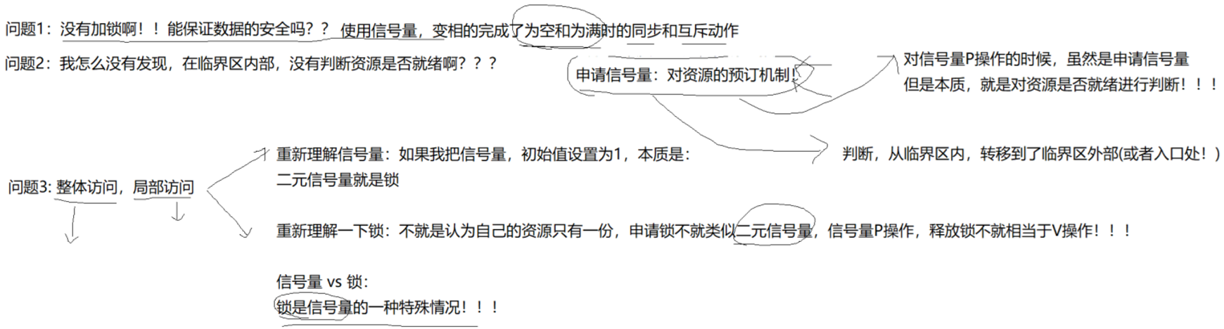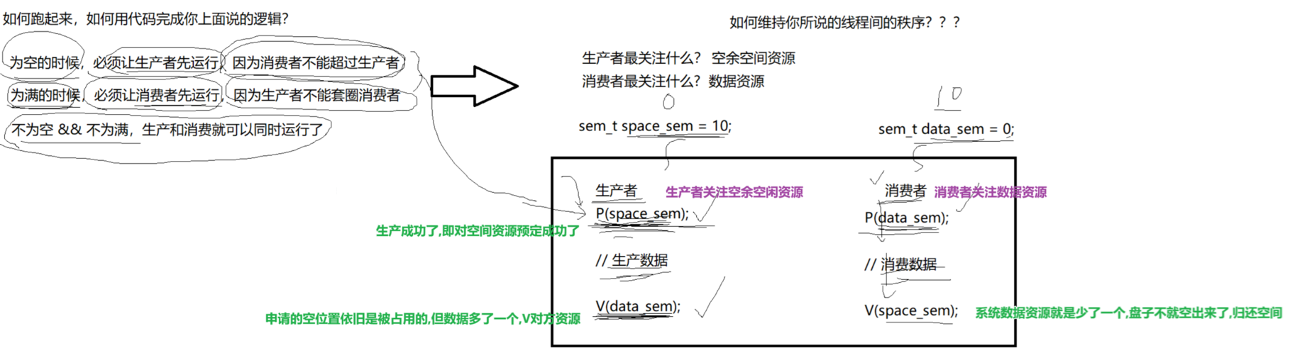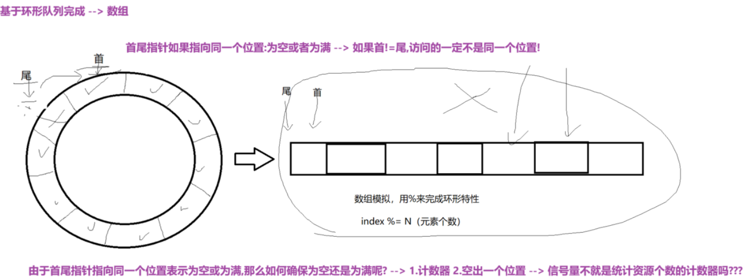 - 为满的时候,必须让消费者先运行 --> 生产和消费又指向同一个位置了! --> 互斥的获取数据 --> 这不就是生产和消费者的互斥与同步关系!