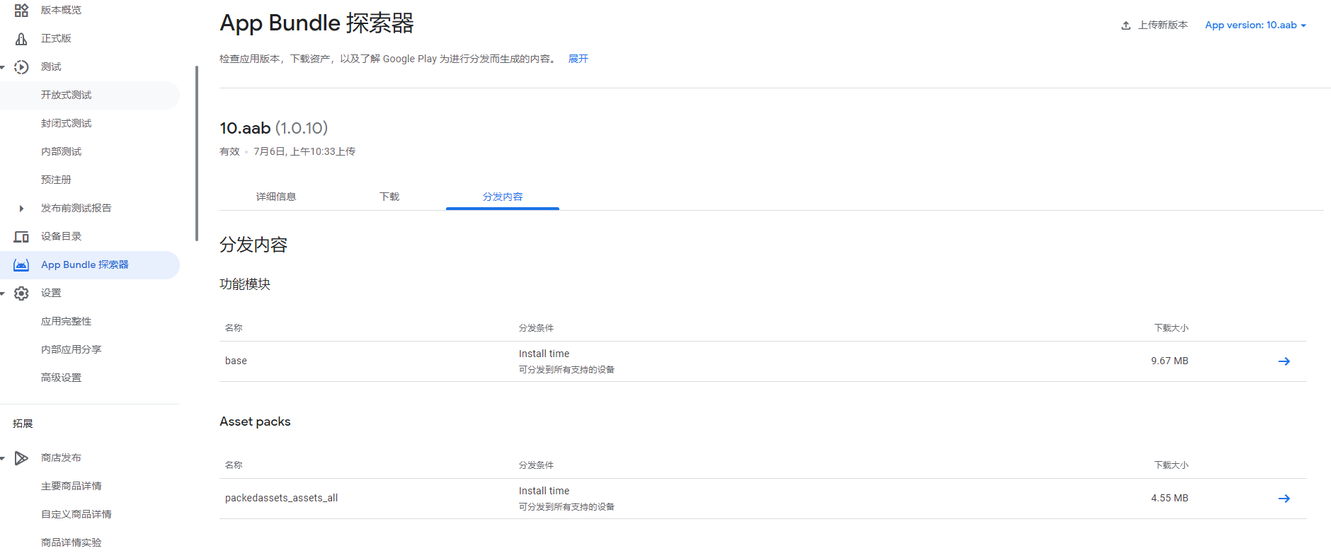 上传完成后,在App Bundle探索器可以看到分发内容,base就是本体包大小,Asset Packs下会列出分发的内容,可以看到那边分发模式会写Addressables那边配置的模式